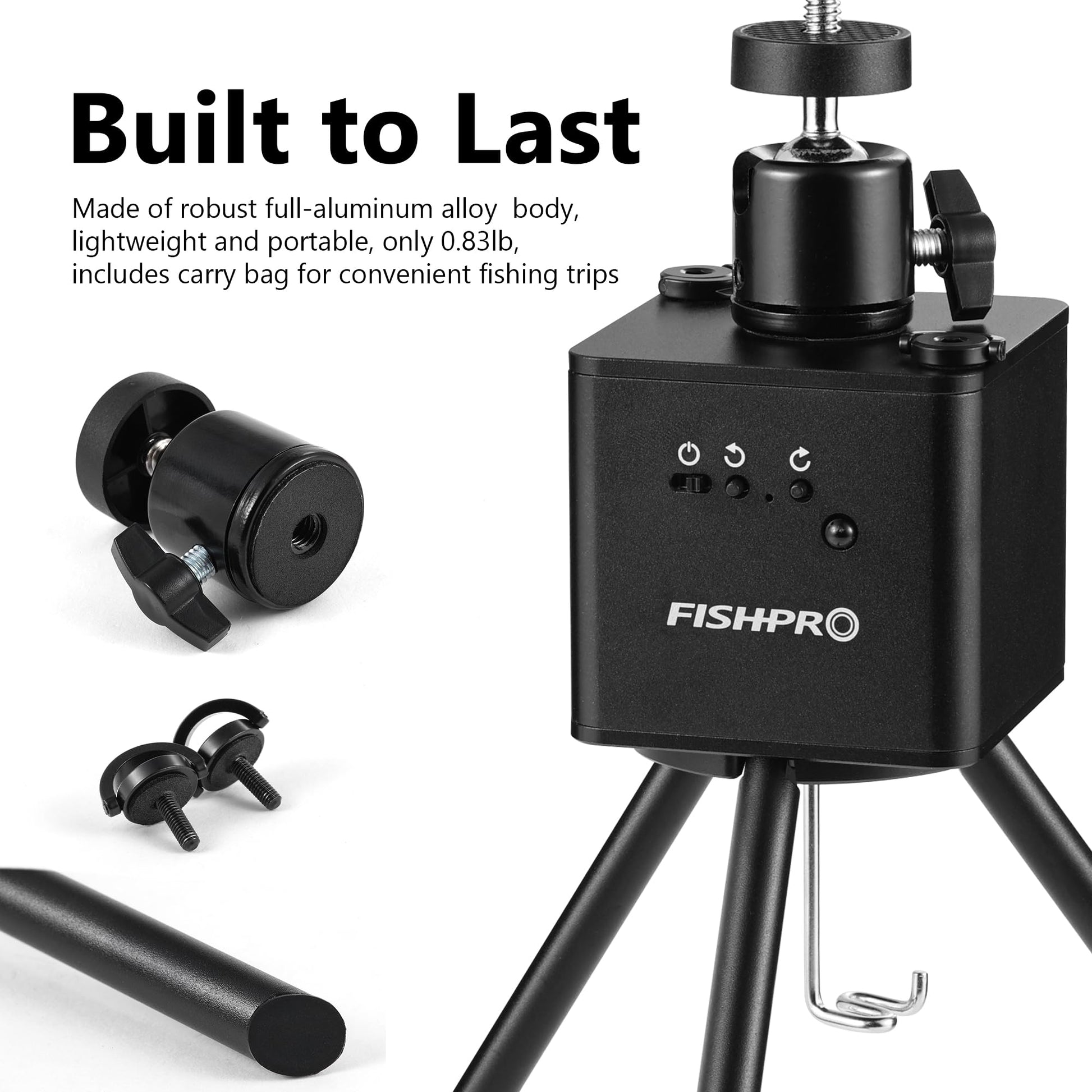 FishPRO M7 DVR tripod, aluminum build, 360° rotation, remote/manual control, stable underwater camera mount.